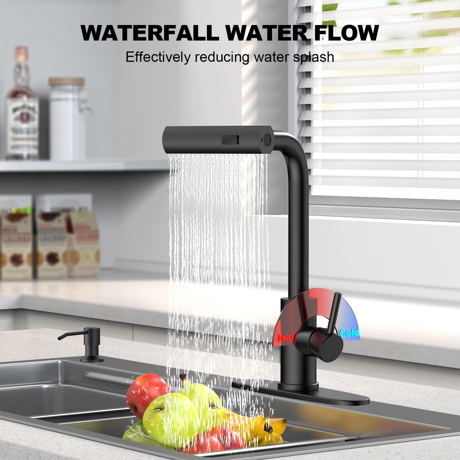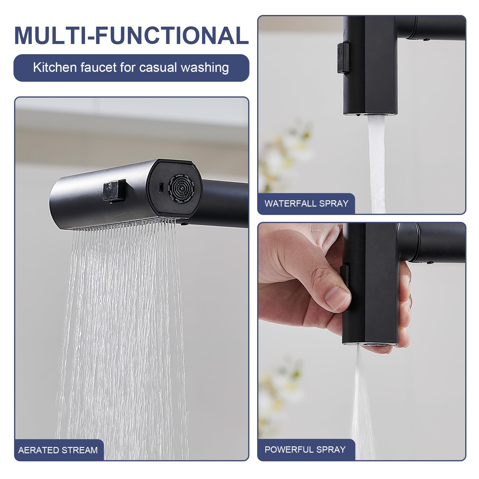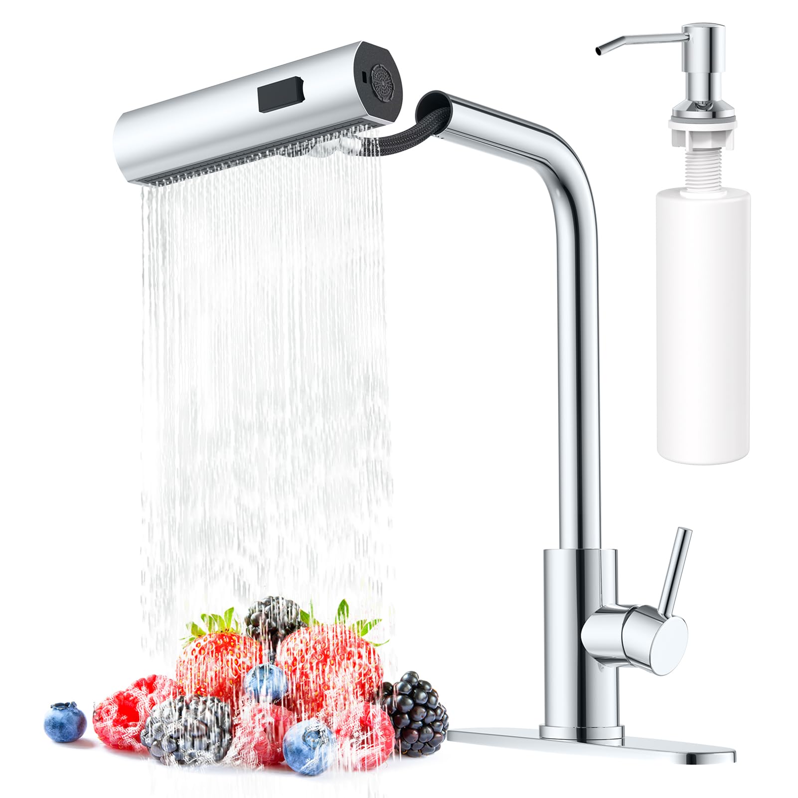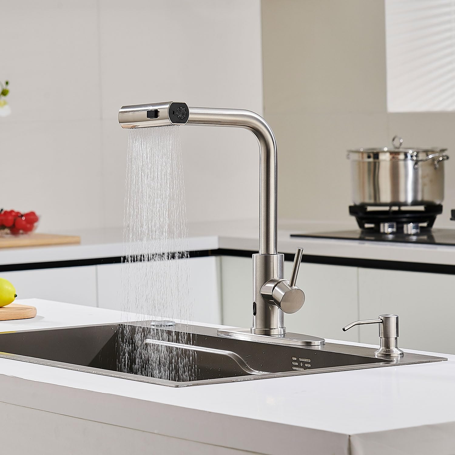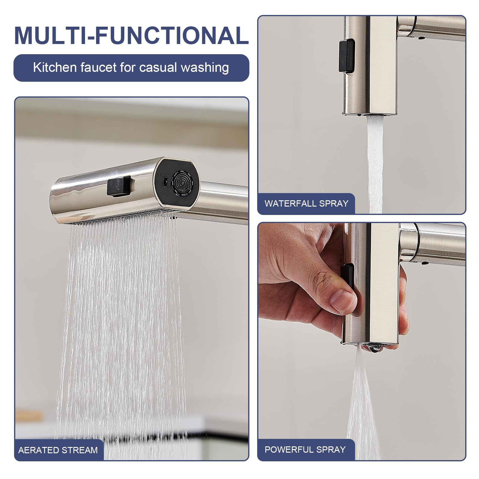 Brushed Nickel Kitchen Faucets with Pull Down Sprayer & Soap Dispenser, Single Hole & Handle, Pull Out Tap, Waterfall Stainless Steel Sink Faucet for Farmhouse Camper Laundry Rv Bar